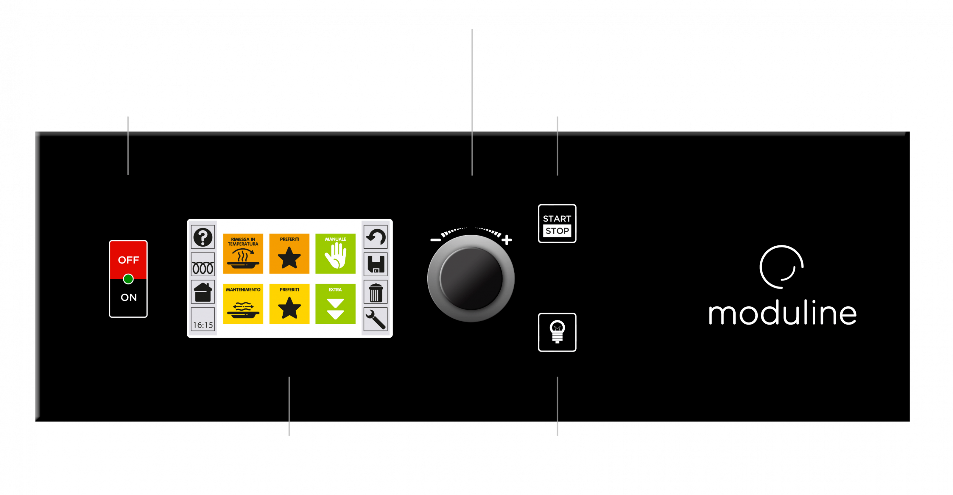 Pour les cycles de travail répétitifs et pour faciliter l'interface utilisateur pour les opérateurs moins expérimentés, Moduline propose un logiciel simplifié qui permet à l'opérateur de démarrer un programme (préconfiguré par un administrateur système) avec la simple séquence de 2 touches. Le logiciel est installé en usine à la place du logiciel complet. Les menus de support technique restent accessibles (disponible uniquement sur le panneau de commande E).